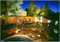 A secluded haven on three acres of landscaped gardens, mature pines, calming waterfalls and ponds, original art, and a magical meditative Labyrinth. Our 14 individually designed and decorated guest suites and rooms have spectacular red rock and mesa views. Features include: private entrances, private outdoor decks and patios, luxurious king, queen, and twin beds, romantic fireplaces, intimate spa tubs (most for two), plush robes, individual climate control, and CD players.