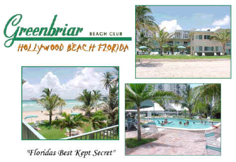 Green BriarWe are an award winning ocean front resort located on the famous "Flowers street" sections of Hollywood Beach, 15 minutes from Ft. Lauderdale on the north, and 30 minutes from Miami on the south. Swim in our magnificent clear blue ocean, sunbathe on our spectacular beach, or rent a bicycle and ride to the pedestrian boardwalk, which is just less than a mile from us. Whether roller blading, walking, or enjoying a drink as you relax in an outdoor café facing the ocean, Hollywood is the place to visit!!! Stay in one of our 47 beautifully furnished studios and one bedroom apartments, all with full kitchens; most with great views of the ocean or our pool and gardens.