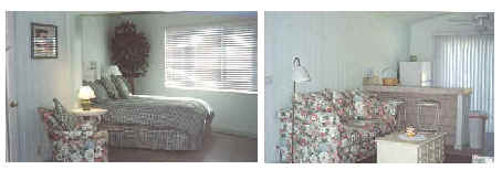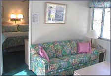 Our large, 315 sq. ft., well appointed efficiency units feature: dining table for 2-4, fully equipped kitchen, a comfortable sleeping and sitting area with cable TV, and two double beds, or one king bed.