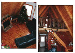 Scenic View Chalet is a 2-bedroom A-frame house that comfortably sleeps 6-8 adults. The master bedroom has a queen-size bed, second floor loft has two twin beds and a trundle bed. Each bedroom has access to its own full bathroom and deck. A new leather sleeper sofa located on the first floor opens into a queen size bed and the den has a futon bed that sleeps 2. The house and furniture is new, built in April 2000, and comes with all modern amenities including a fully equipped kitchen with dishwasher, gas fireplace, air conditioning/furnace, CD/tape player, and satellite TV with VCR. Bed linens are provided. Outside, enjoy the hot tub, gas grill, fire pit, deck furniture, and of course the breathtaking views. There's also an outdoor shower for mud runners.