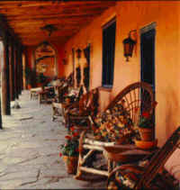 The Grand Portal stretches the expanse of the main entry and is an inviting place to sit and talk and enjoy the peaceful splendor of the Taos sunrise or sunset.