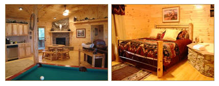 Each 1500 sq' cabin is beautifully appointed with 2 bedrooms, 2 baths, and full kitchen. Special features include: stone fireplace, double jacuzzi, and a long covered porch.