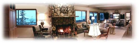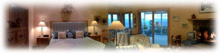 Our two spacious guest suites are individually decorated with your every comfort and pleasure in mind. Each guest suites features: private bath · jet tub for two · steam cabinet shower · small refrigerator · king size bed with down comforter · sitting area with sofa, easy chair, and woodburning fireplace · window seat with table & chairs · CD player/ clock radio · private telephone line · satellite TV & VCR · video and CD library · use of outdoor hydrotherapy hot tub · expansive deck with incredible views.